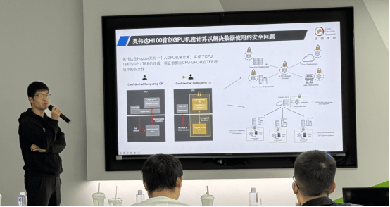 最后,纽创信安产品总监胡逸众汇报了OSR在如今AI浪潮备受关注的AI安全的研究成果:《筑牢 AI 芯片安全底座:护航智能时代的核心算力安全解决方案》。本报告聚焦AI芯片的安全设计,通过分析英伟达H100和谷歌云Titanium安全架构,给出AI芯片的安全架构建议。通过该安全架构可以实现CPU与AI芯片的TEE环境,保证AI数据处理过程的全生命周期安全。OSR提供AI芯片安全整体解决方案,通过OSR的安全IP和软件层,可以建立AI芯片与CPU的异构TEE环境,保护数据、模型在使用过程中的安全。
